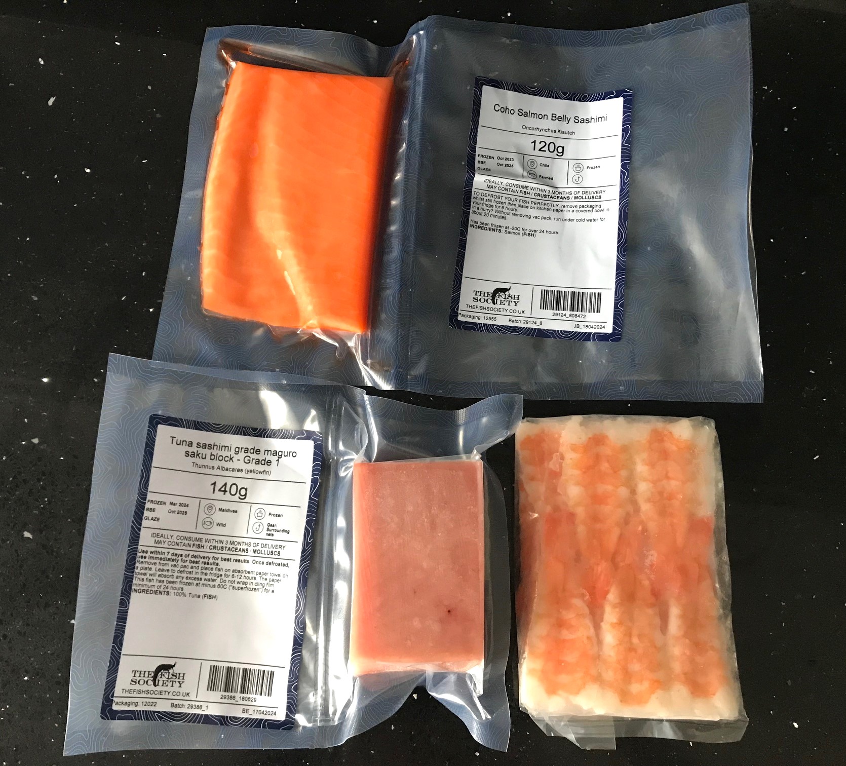 Below are photos of the salmon and tuna The Fish Society sent me. This is a top-quality Coho Salmon Belly Sashimi Strip and a top-quality Tuna Sashimi Grade Maguro Saku block. The salmon was buttery and incredibly smooth, the tuna was mild but tender, and the taste and texture of this sushi-grade fish was superlative to anything I’ve had in the past. If you want to make the best sushi possible in the UK it has to come from The Fish Society.