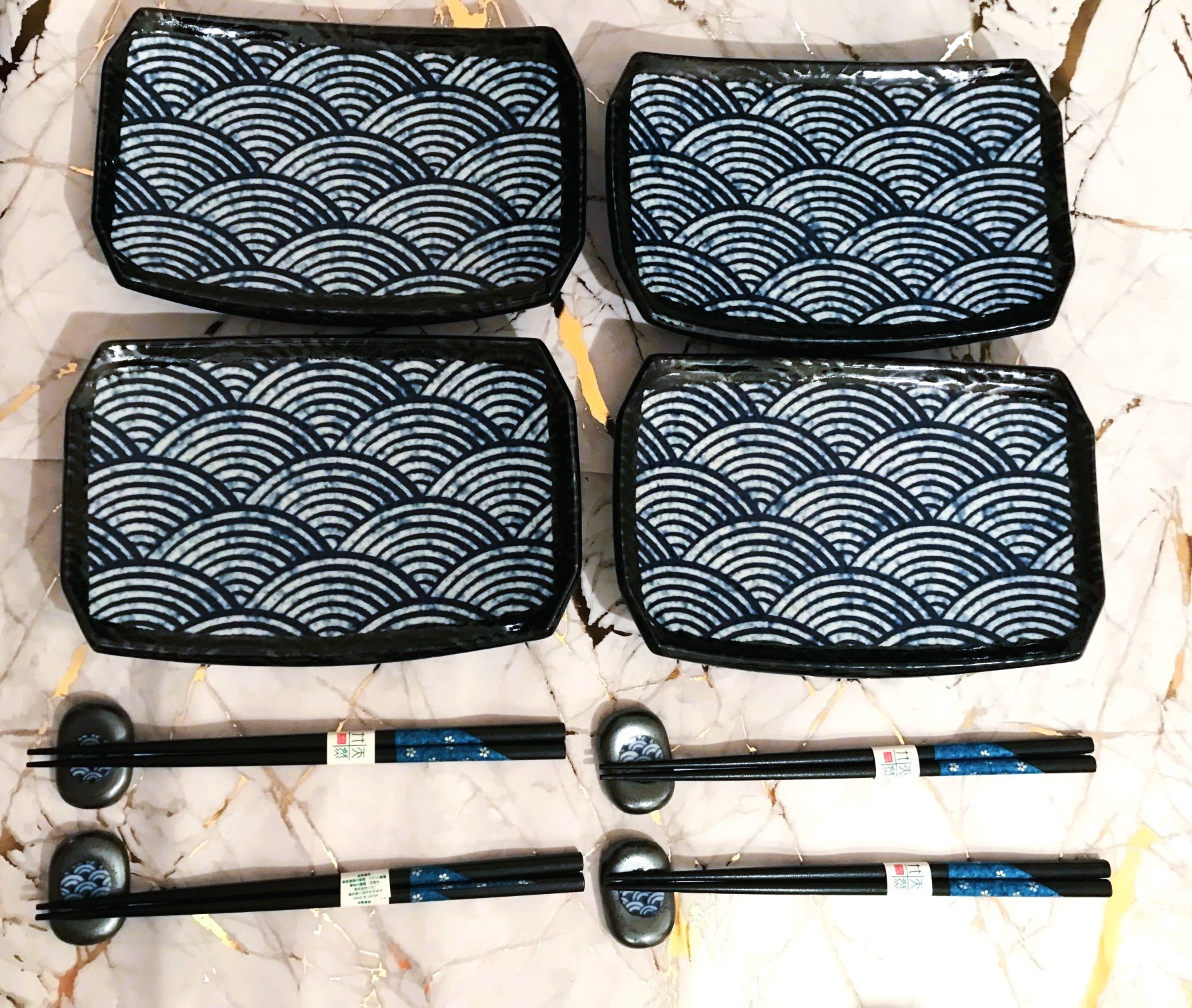 I was able to make this sushi with the generosity of the following online shops: The Wasabi Company kindly sent me this cookbook along with some ingredients, including some fantastic Wasabi Powder and Ma Kombu, to enhance my sushi rolling extravaganza. The Japanese Shop, based in Harrogate in the UK, sent me some beautiful Seikaiha Oblong Japanese Sushi Plates, Blue Cherry Blossom Japanese Chopsticks, and Seikaiha Japanese Traditional Chopstick Rests. I’m in love with their tableware. The photo of these plates below does not do them justice. The quality is superb. Finally, The Fish Society, the UK’s premier online fishmonger, sent me their Sushi Kit including salmon, tuna, and prawns (definitely the best fish for sushi I’ve ever tasted) as well as their Sushi Accessory Kit which came in handy.